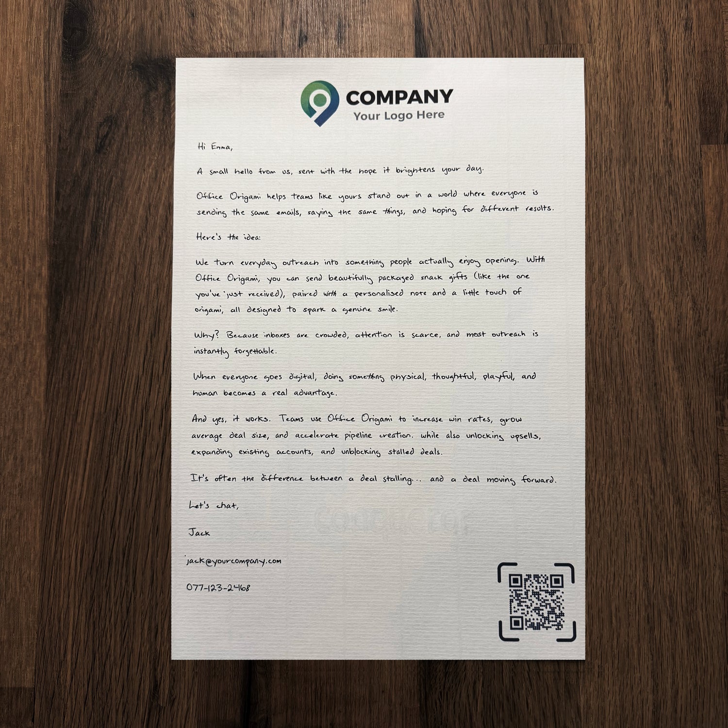 Each Office Origami gift includes a beautifully branded robot-written letter, crafted using our unique system that randomises letter shapes for a natural, human feel. Every message is printed on premium textured paper and tailored to your company, adding a surprising, thoughtful touch that makes every gift feel personal, memorable, and genuinely delightful.